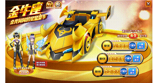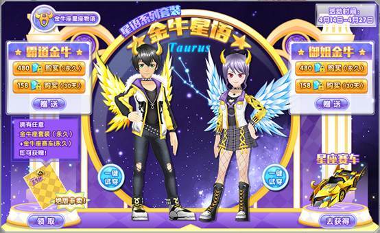仅需480钻即可拥有全套五件特效服装!金牛座专属翅膀等你来拿!拥有金牛座赛车和永久期限金牛星语服装还可以免费领取非卖稀有单件-------金牛座背景卡(永久)哦!