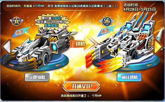 专属炫光给你独一无二的尊贵体验!王牌级性能让你称霸整条赛道,成为赛道上名副其实的至尊!最强推进,动力无穷,让你感受炫光系列赛车推进之王的力量!同期开通三个月VIP得永久幻影赛车活动荣耀回归,让你轻松获得至尊白虎!