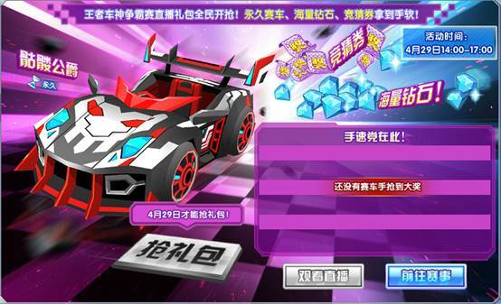 比赛期间来观看赛事直播的赛车手还有海量好礼可以领取哦!永久赛车、海量钻石、竞猜券等大礼都等着你来拿哦!