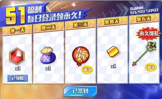 每日登录进行签到,累积签到一定天数,即可获得五一快乐尾挂(永久)和先行特效单件苍穹绝音手杖(永久)!快来免费领福利吧!