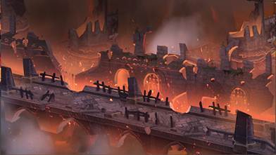 焚炎谷中曾经有着一个繁华的王国,但是这个王国却因为私欲大肆破坏环境,损害了自然的法则,从而被愤怒的火神席卷,化为了如今这片沐浴着火焰的斑驳遗迹。