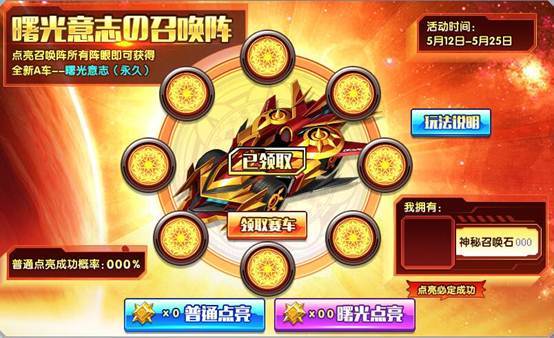 只需花费少量神秘召唤石,点亮所有阵眼,就能成功将曙光意志召唤出来哦!次点亮失败也能获得女神的加护,获得返还的好礼哦!