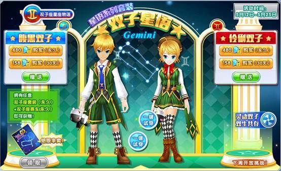 仅需480钻即可拥有全套特效服装!下周后,拥有双子座赛车和永久期限双子星语服装还可以免费领取非卖稀有单件-------双子星语背景卡(永久)哦!