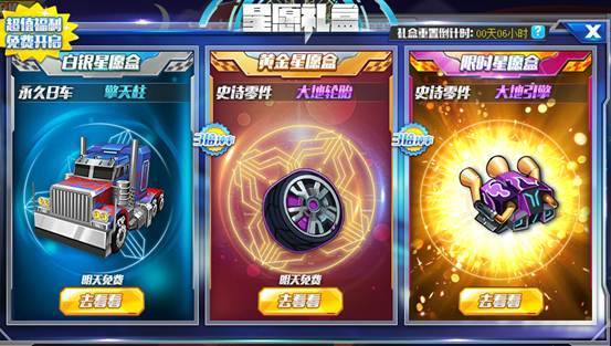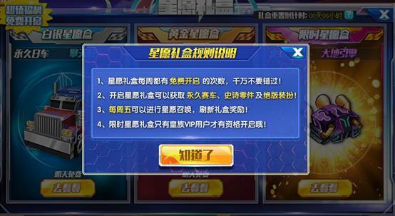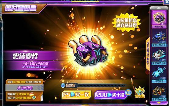 限时星愿礼盒只有皇族VIP玩家才可以开启,费25钻石购买一个经验蛋糕可开启一次,有机会获得全新A车史诗零件-大地引擎。