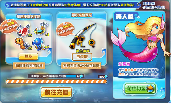活动期间充值金额满200钻,即可免费领取价值388钻的高级鱼竿——黄金鱼竿!