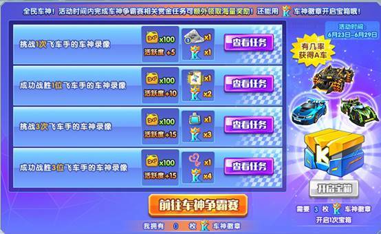 还可以收集车神徽章,使用车神徽章可以开启车神宝箱,有几率获得A车哦!