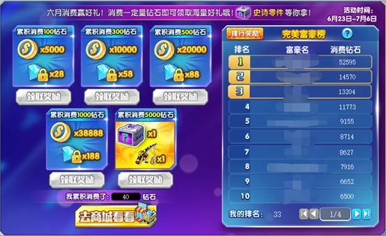 累积消费一定的金额,不仅有海量钻石可以免费领取,还有全新钓鱼道具——龙纹鱼竿和紫色零件箱等着你!