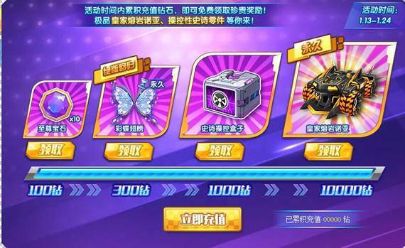绝版超珍稀服装-----彩蝶翅膀,操控性史诗零件、极品皇家熔岩诺亚!只要在活动期间充值满一定数额的钻石!就可以把他们全都带回家哦!