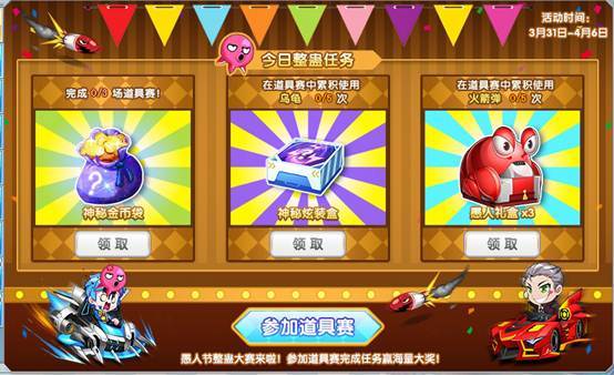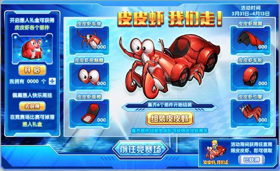 勇敢的赛车手们,你们能唤醒传说中的深海霸主皮皮虾吗?带上你的愚人快乐尾挂,去竞赛场比赛就有几率掉落愚人礼盒哦!集齐六个部件,就能成功组装皮皮虾!活动期间成功唤醒皮皮虾的赛车手,还能获得永久皮皮虾我们走前景卡哦!