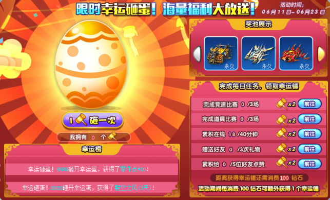 完成每日任务,领取幸运锤,幸运砸蛋,开启超值大奖!