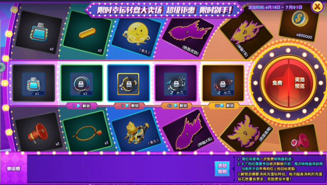 6月18日-7月1日期间,每位玩家有一次免费转动转盘的机会