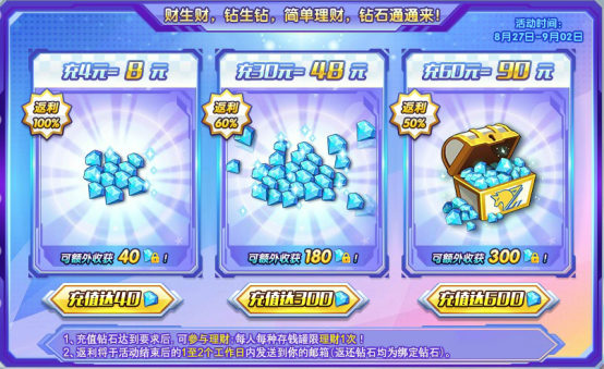 充值达到要求可参与理财,每人每种存钱罐只限一次哦!