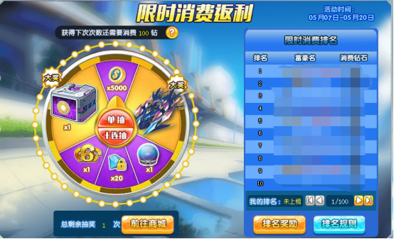 在商城及活动中每消费100钻可获得一次抽奖机会,