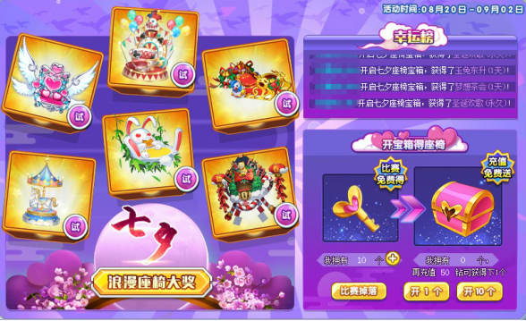 每充值50钻即可获得1个七夕座椅宝箱